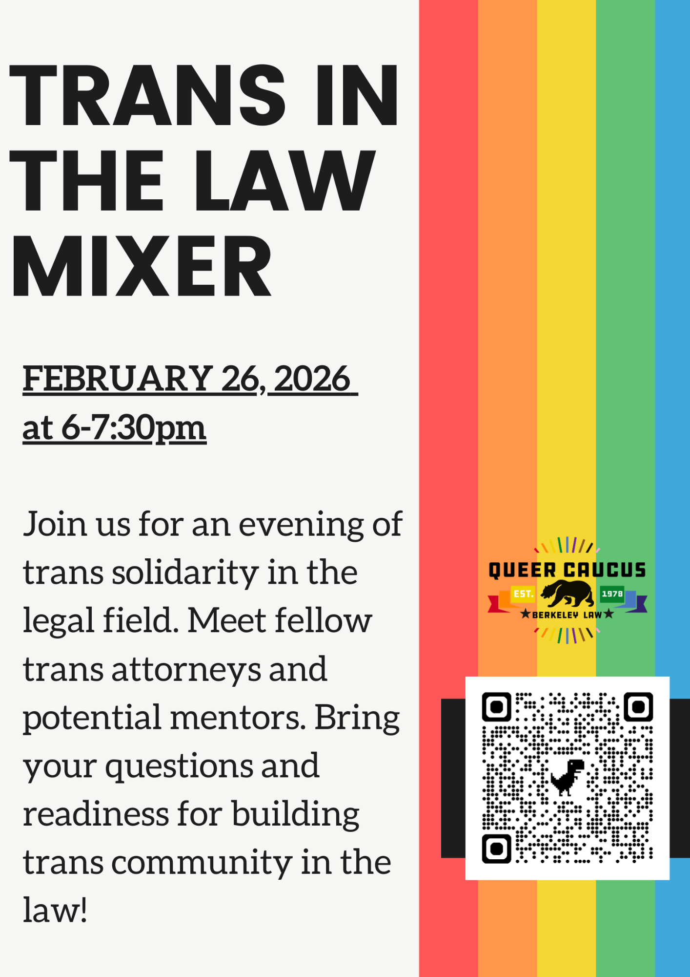 Berkeley Law School's Queer Caucus is organizing a Trans Law Mixer on Feb 26, 6-7:30 pm in Berkeley, California, at Freehouse (details in the QR Code form on the flyer), bringing together Berkeley Law and broader Bay Area law students with trans attorneys.
