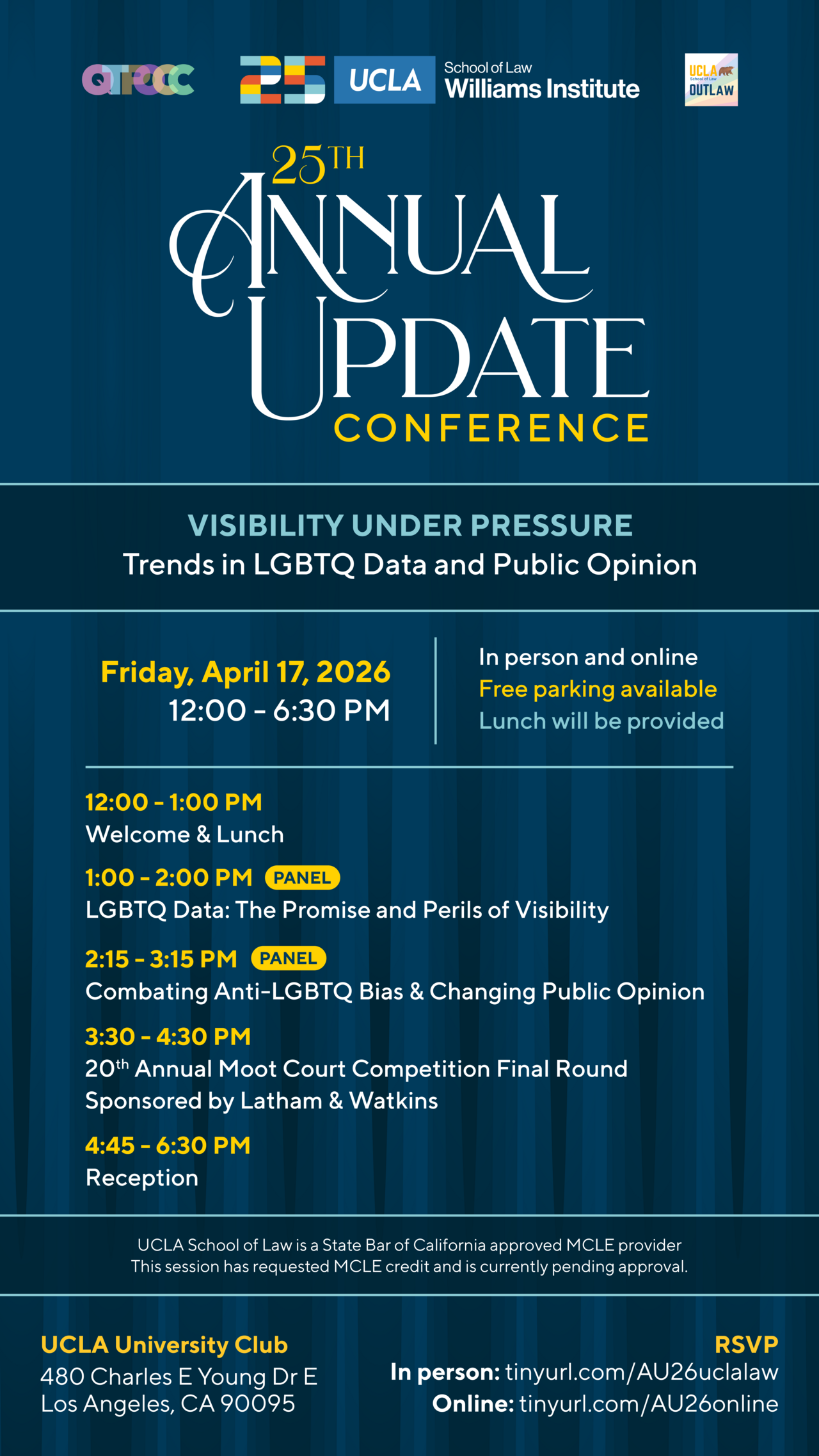 For 25 years, the Williams Institute has produced rigorous research that matters to LGBTQ law and policy. Please join us on April 17 for our Annual Update Conference— an afternoon of panel discussions, the finale of our Moot Court Competition, and a reception to close out the evening. Admission is free and open to all. We hope to see you there!