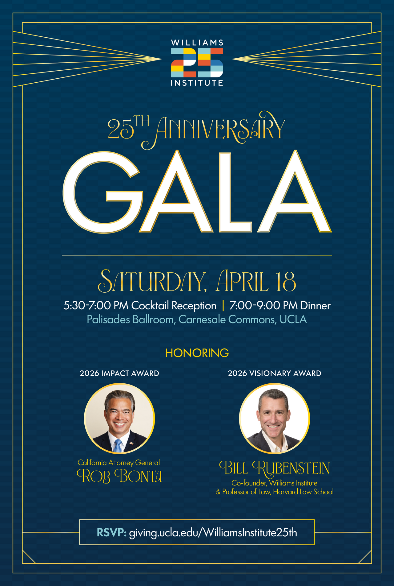 Our celebration continues the following evening with our 25th Anniversary Gala at Carnesale Commons at UCLA. The evening will honor a quarter-century of LGBTQ research — and look ahead to the next 25. We are excited to honor the visionary work of California Attorney General Rob Bonta and the Williams Institute's co-founder, Bill Rubenstein.
