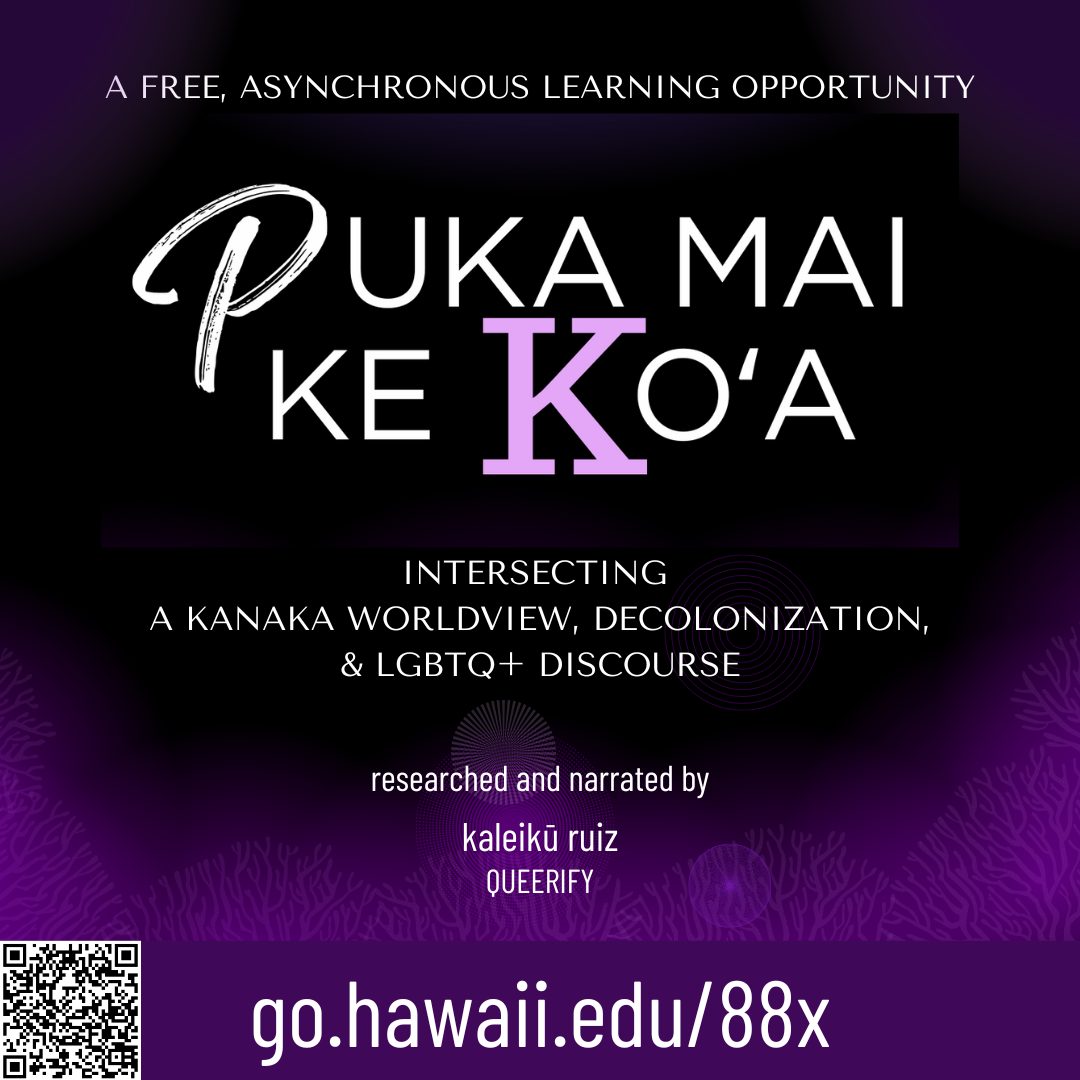 Kalei Ruiz, a mahu educator, has curated the events, and has also created a free, self-paced course exploring Hawaiian worldview, settler colonialism and LGBTQ+ discourse, examining cultural impacts and offering Hawaiian perspectives. Puka Mai Ke Koʻa is open to all—students, faculty, staff and the public. Everyone, everywhere can sign up for free this semester and gain a certificate!