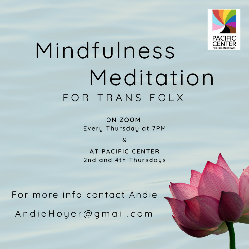Pacific Center is thrilled to offer a Weekly Mindfulness Meditation group created for and by the Trans community. This is a dedicated space to breathe, connect, and nurture your well-being…